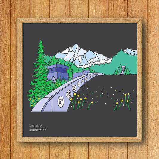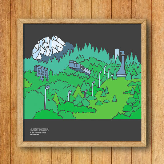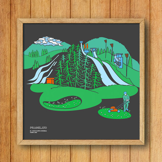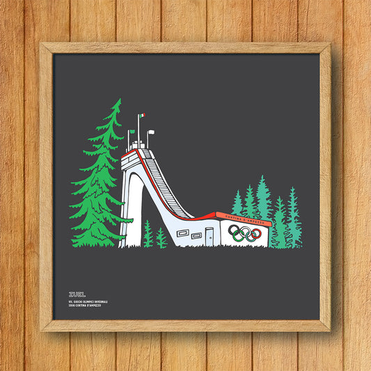This is a unique series of illustrated digital prints of Olympic Ski Jumps in the French, Austrian and Italian Alps. They feature a pearly ink on black card, 300mm square. Limited edition.